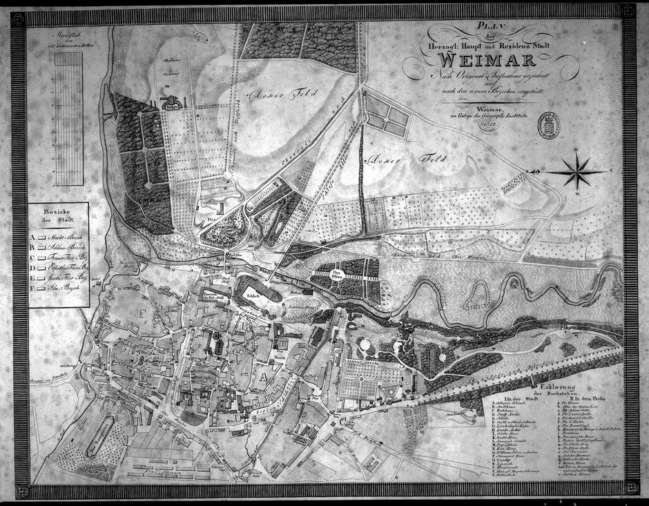 Titel: Plan der Herzogl. Haupt- und Residenz-Stadt Weimar : Nach Original-Aufnahme gezeichnet und nach den neuen Bezirken eingetheilt ⁄ gestochen von Theodor Goetz