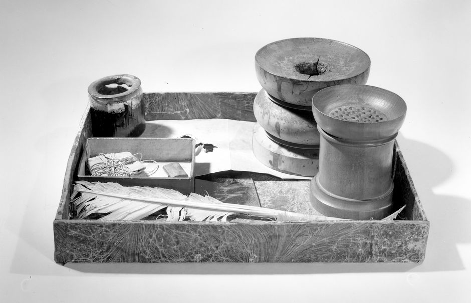 - Tintenfass; Streusanddose; Kleines Tintenglas; Rechteckiges Kästchen mit Inhalt: Kleines Bindfadenknäuel und ein rechteckiger Magnet; Bindfadenknäuel