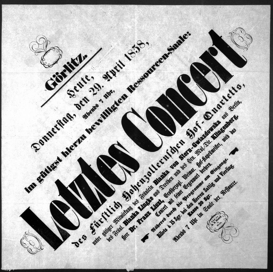 Programm Letztes Konzert des Fürstlich Hohenzollernschen Hof-Quartetts, .... Görlitz, 29. April 1858 Signatur: GSA Liszt Nr. 243