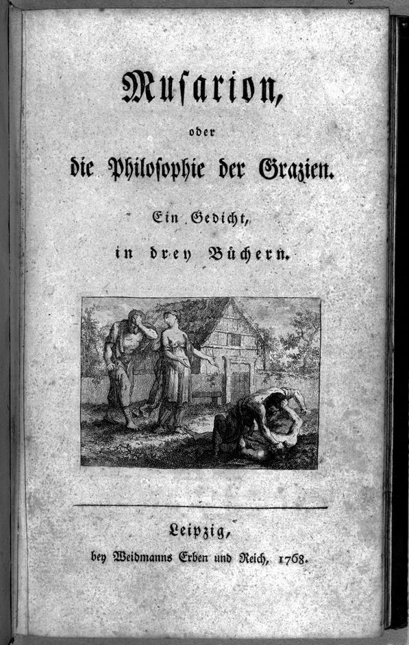 Reproduktion Titelblatt aus Titel: Musarion, oder die Philosophie der Grazien. Ein Gedicht, in drey Buechern. ⁄ [Christoph Martin Wieland] Verfasser: Wieland, Christoph Martin *1733-1813* Erschienen: Leipzig, bey Weidmanns Erben und Reich, 1768 Drucker: