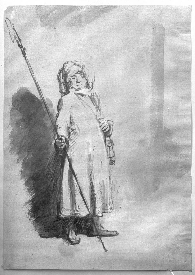 17 Bl. "verschiedene Skizzen von Rembrandt und seinen Schülern und Nachahmern", Junger Mann, stehend, in der Rechten eine Lanze
