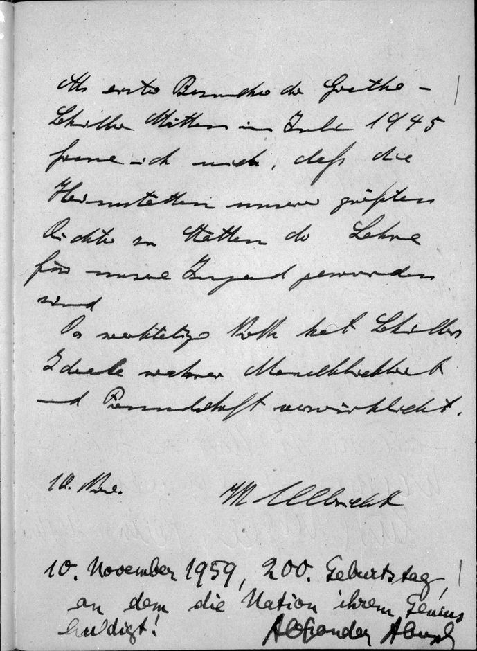 am 10.11.1959 in das Gästebuch von Schillers Wohnhaus anläßlich des 200. Geburtstages Friedrich Schillers