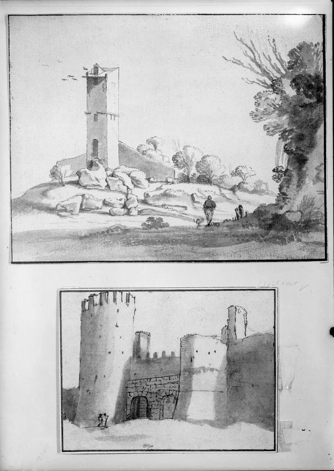 - "Mauer mit Zinnen und Thürmen"; Turm mit Pultdach und einem Mauerstück, "Ein viereckiger schmaler Thurm mit einem Stück Mauer daran, rechts vorn ein Felsen"
