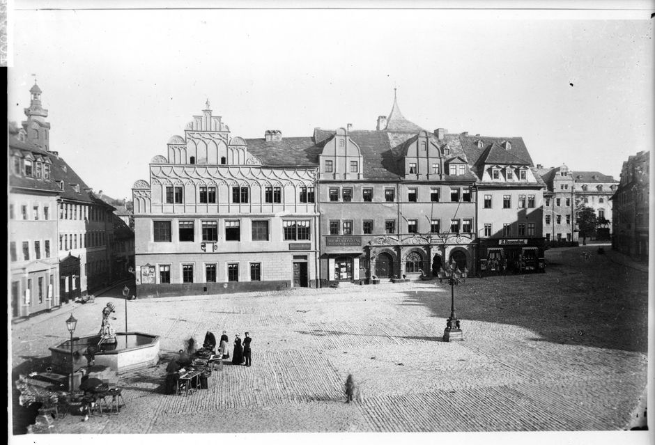 Marktplatz in Weimar mit Stadthaus und Lucas-Cranach-Haus, links die Hofapotheke Aufnahme Anfang des 20. Jhd