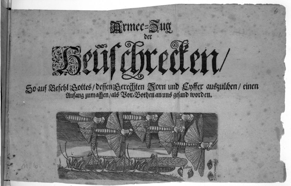 Titel: [Armeezug der Heuschrecken] Armee-Zug der Heuschrecken : so auf Befehl Gottes ... als Vor-Bothen an uns gesand worden Erschienen: [S.l.], 1693 Umfang: [2] Bl. ; 8º Signatur: Scha BS 1 B 00437 (2) Anmerkung: Brandschaden durch Bibliotheksbrand 200