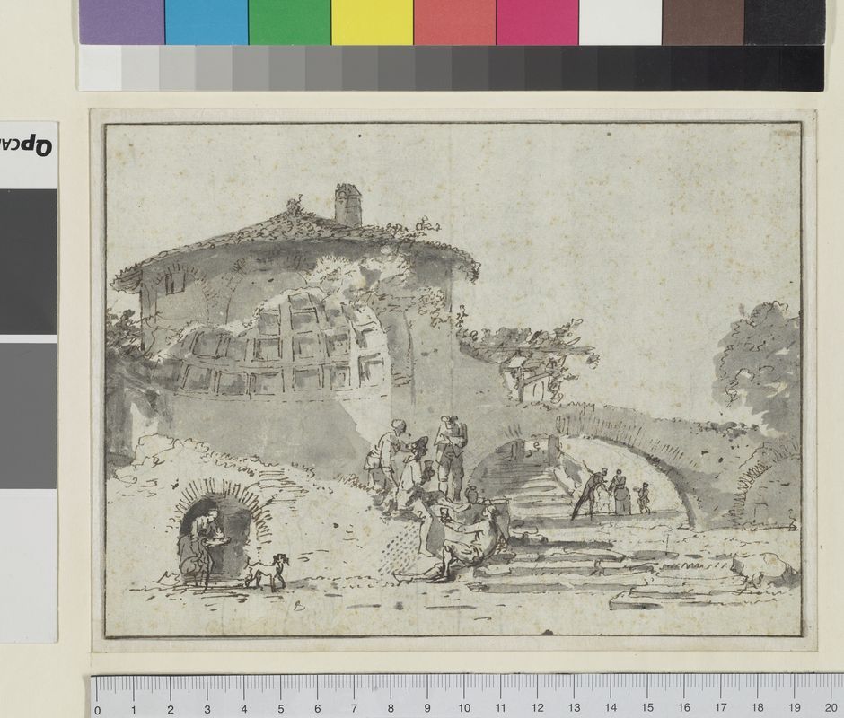 Schenke in den Ruinen eines antiken römischen Gebäudes, "Schenkwirthschaft in den Ruinen eines antiken römischen Gebäudes mit einer Brücke daran"