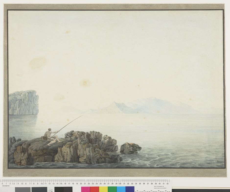 - Bocca di Capri (Felsen mit Fischer), "Felsen im Meer, auf einem derselben vorn ein angelnder Fischer, in der Ferne wahrscheinlich die Küste von Neapel mit dem Vesuv"