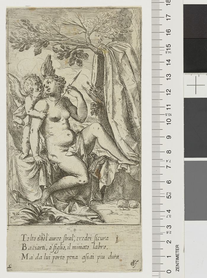 - aus der Folge:"Scherzi d´Amore espressi da Odoardo Fialetti, pittore in Venetia" (Amors Spiele), Blatt 2: Venus mit einem Pfeil vor Amor sitzend; "Die Spiele Amors: Scherzi d'Amore espressi da Odoardo