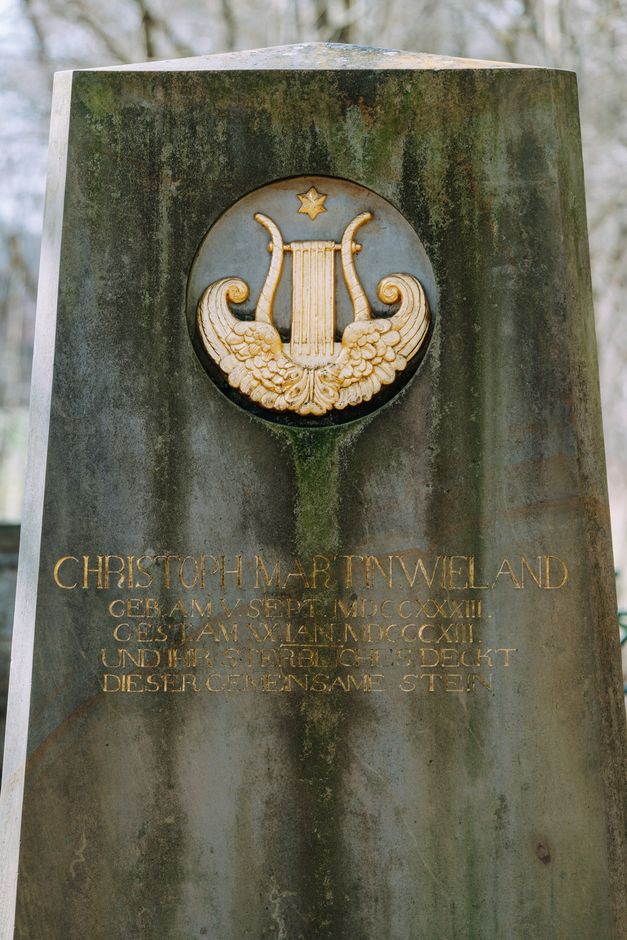 Dreiseitiger Obelisk aus Sandstein von Carl Gottlieb Weisser als Grabmal von Wieland, seiner Frau Anna Dorothea und Sophie Brentano