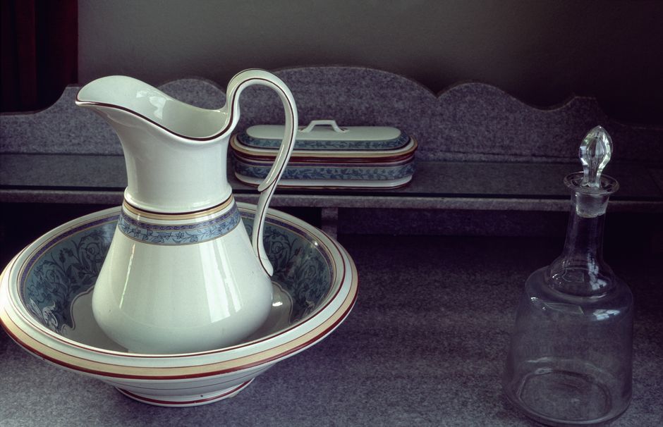 - Waschgarnitur, 3-teilig: Dose mit Deckel für Zahnbürste; Waschgarnitur 3-teilig: Wasserkrug; Waschgarnitur 3-teilig: Waschschüssel