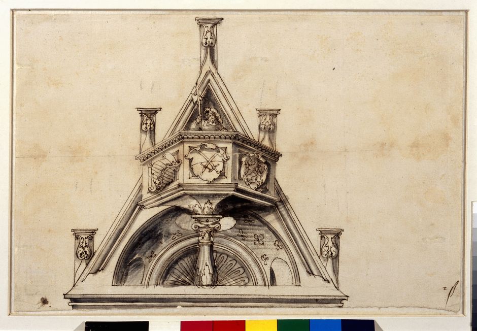 Architektur-Entwurf: Giebel mit Wächter auf einem Balkon