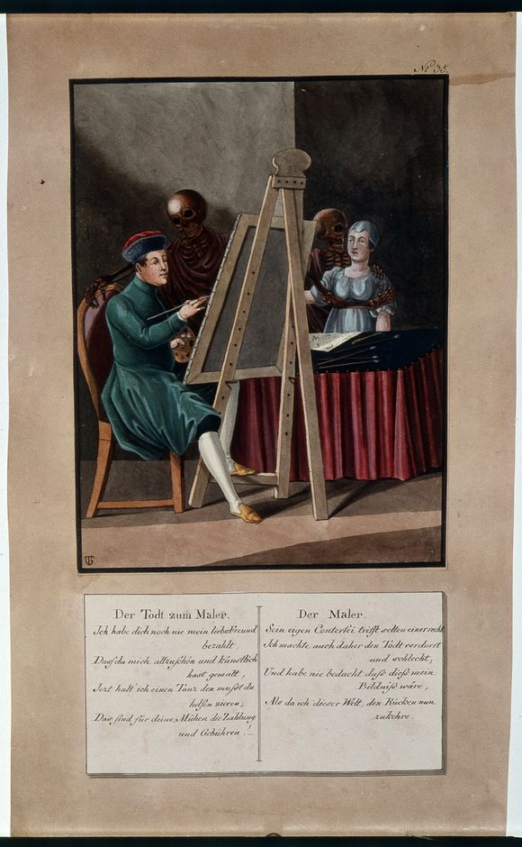 Titel: Der "Todten-Tantz" nach Beck, Nöller u. anderen Malern Verfasser: Götz, Georg Maximilian Theodor *1834 Erscheinungsjahr* Erschienen: Weimar, 1834 Umfang: [2] Bl., 56 Kunstbl. : farb. ; ca. 42,5 x 26 cm, Bl. 54-56 ca. 45 x 35,5 cm Kolorierte Zeic