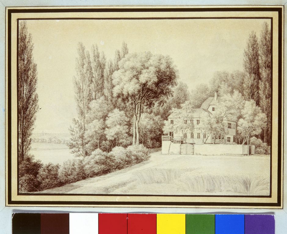 - "Ein Landhaus unter dichten Bäumen, davor ein Getraidefeld, links ein Fluß. Der Schützesche Garten bei Frankfurt."