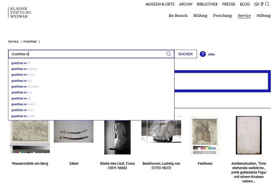 Die Suche schlägt Ihnen dabei während der Eingabe mittels einer Vorschlagfunktion Suchbegriffe oder Suchtreffer (Bildtitel) vor: