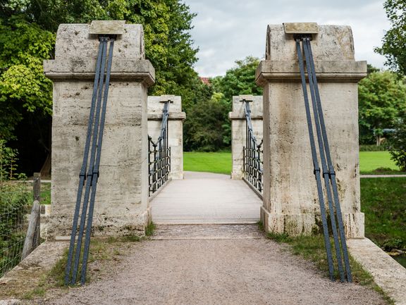 The Court Master Builder Karl Friedrich Steiner (1774-1840) built the Swinging Bridge in 1833 as a “true” suspension bridge after Grand Duke Carl August had designed and completed the landscaped Park on the Ilm from 1778 to 1828. The suspension method in bridge-building was still rather new in 1833. The first iron chain bridge was built in England in 1741, and others were constructed in North America at the beginning of the 19th century. Compared with the conventional, “stable” stone or wooden-plank bridges of that time, the swinging chain bridge across the Ilm River caused such a sensation that it came to be called the “Swinging Bridge” ever since. The Swinging Bridge is part of the “Classical Weimar” UNESCO World Heritage ensemble and is one of the oldest, functional chain bridges in Europe.