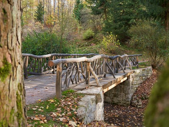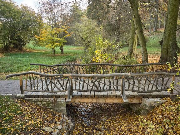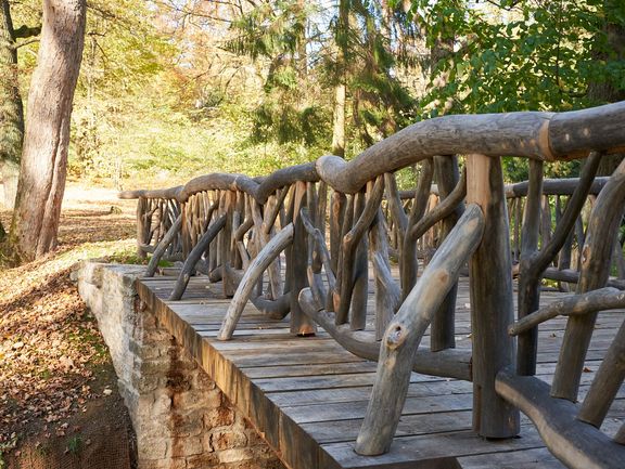 Both bridges are similarly designed with natural stone abutments, steel girders, wooden planking and railings made of natural, unrefined logs. Although no historical drawings or designs of the bridges exist, numerous historical descriptions give reason to believe that they were similarly constructed in the 18th century. Thanks to their natural appearance, the bridges fit harmoniously into the landscaped park to this day.