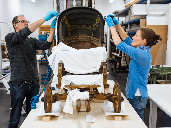 The textile conservation studio is responsible for preserving a widely diverse and multifaceted collection of objects dating from the early modern era to the present with a particular emphasis on Weimar Classicism and the Bauhaus years. These items include rugs, tapestries, clothing, accessories and decorative arts exhibits comprised of or with textile and leatherparts, such as upholstery or covers of furnitureand objects from Goethe’s natural scientific collection. This specialist unit bears the conservatorial responsibility for the entire collection of carriages and historical vehicles.