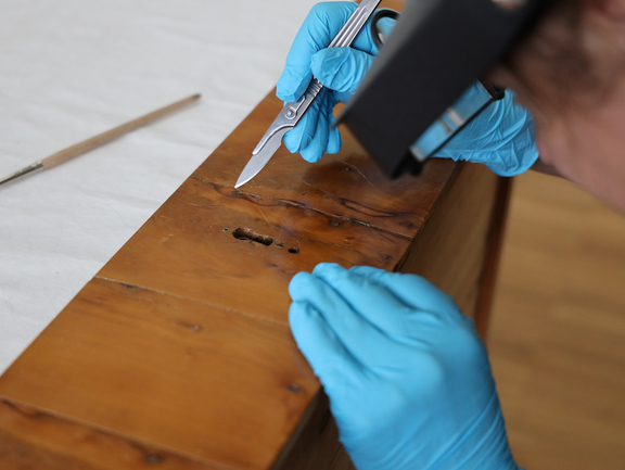 The specialist unit for conservation-restoration of furniture and wooden objects is currently responsible for preserving a total inventory of approximately 4,700 objects dating from the early modern era to the present. About a half of these are on permanent display. In addition to the residences of the poets and the ducal estate, this unit also manages the Ducal Vault, historical keyboard instruments, and objects from Goethe’s natural scientific collection. Complex combinations of various materials with wooden elements in decorative arts objects, as well as textiles and leather in furniture, require interdisciplinary collaboration with the expert conservators in the areas of arts and crafts and textiles/leather.