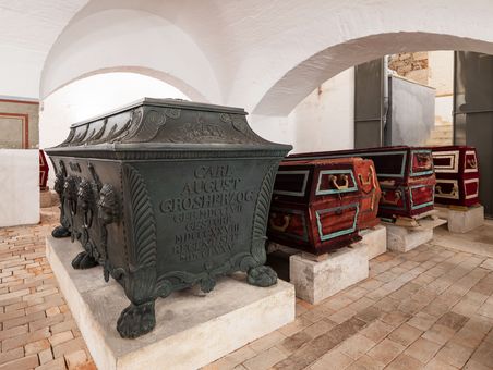 The Ducal Vault was erected in the Historic Cemetery between 1823 and 1828. This extraordinary mausoleum is not only the burial place of the rulers of the Saxony-Weimar and Eisenach dynasty. The two greatest poets of the Weimar Classical period, Goethe and Schiller, were interred here as well in 1832 where their caskets remain alongside those of the ducal family.