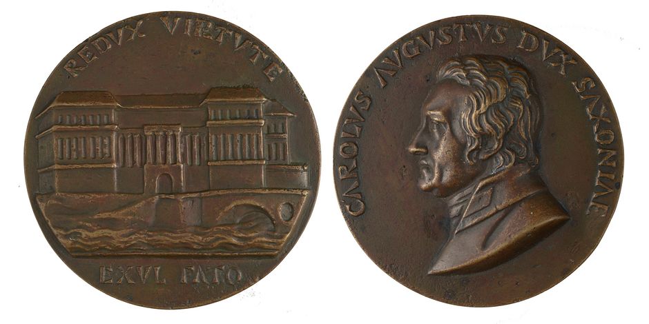 The bust of Carl August on the front is rendered in much starker relief, literally elevated in sublime grandeur. The face, hair and garments of the Duke are prominently depicted. The lettering possesses something both archaic and powerful. The text on the reverse is just as simple and short, summing up the reconstruction of the castle in one sentence: