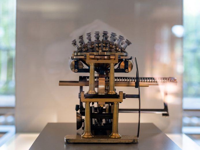 The writing ball from the estate of Friedrich Nietzsche is a technical device of especially unique and almost otherworldly beauty. Its name comes from its concentrically arranged keys on top which create its spherical shape. To write with this machine, one would fix a piece of paper onto the curved frame in the lower part of the device. In contrast to the typewriters of the 20th century, the writing ball has no outer cover so that one can admire the mechanisms of brass and steel inside. Developed by the Danish inventor Malling-Hansen in 1865 and patented in 1870, the writing ball was the first serially manufactured writing device. Around 180 pieces were produced of which only 30 still exist today. Malling-Hansen worked as a full-time instructor at a school for the deaf and mute in Copenhagen. He noticed while working with his students that they were able to phonetically spell with their fingers faster than someone could normally write by hand. This is how he came up with the idea of the “scrivekugle”, or the “writing ball”. With his machine one could achieve optimal speed using all ten fingers.