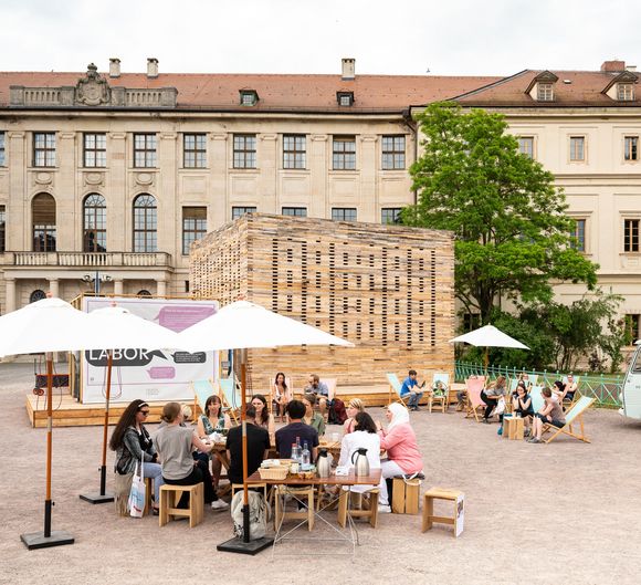 The wooden pavilion was designed and built by the architectural firm "Studio Booom". It is built entirely of wood from damaged felled trees that grew in nearby parks (Park an der Ilm and Park Belvedere). Through the Co-Labor the timber is already being reused for the second time, as it was previously used for the Green Labor.