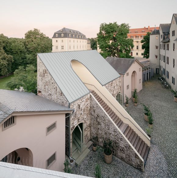 Designed by the Berlin-based architect Helga Blocksdorf, the environmentally friendly, prominently visible structure is constructed with solid plywood panels which extend high above the Coudray Wall at the Platz der Demokratie. For the next five years, the Erlebnisportal Weimar will establish a spatial, formal and thematic connection between the garden monument of the Park on the Ilm and the historic buildings of Weimar Classicism. An integrated viewing platform will enable visitors to enjoy a glorious view of the park, the Herzogin Anna Amalia Bibliothek and the City Castle.