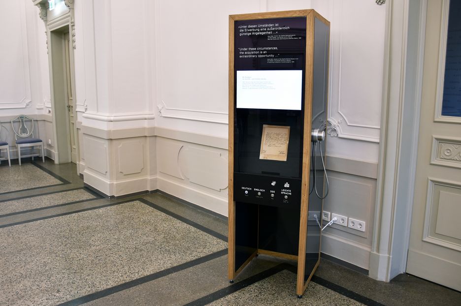 Since November 2015 the Klassik Stiftung Weimar has presented a mobile display case to inform visitors about these ongoing activities. In 2018 the case was redesigned for greater handicap accessibility. It is displayed rotationally in the foyers and lobbies of the collection-holding institutions of the Klassik Stiftung Weimar. It contains various objects identified as Nazi-confiscated property, sheds light on the fates of their former owners and documents the investigative methods of the provenance research carried out within the Klassik Stiftung Weimar.