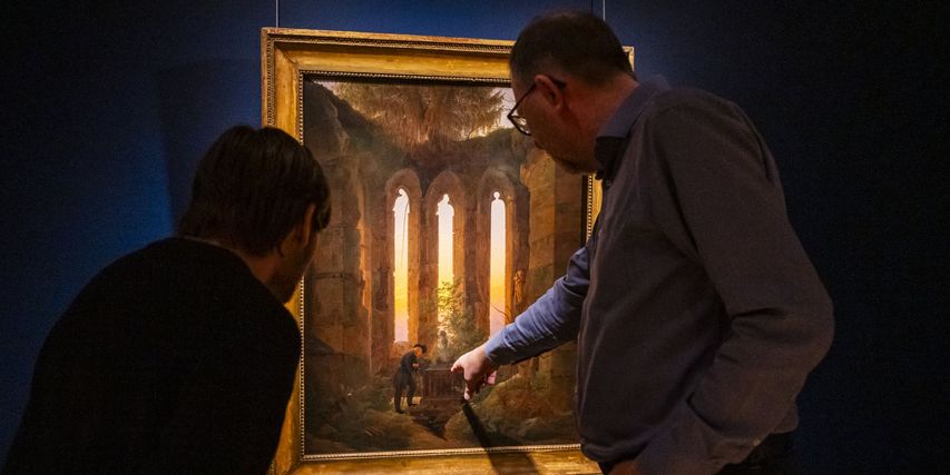 Selected provenance histories shed light on more recent developments, such as the politicization of Caspar David Friedrich's art during the era of National Socialism or the theft of thirteen paintings, including Friedrich’s Weimar Rügen Landscape with the Rainbow, from Schwarzburg Castle in Thuringia shortly before the withdrawal of the American occupying forces in 1945. In addition, multimedia presentations based on conservation and material studies carried out especially for the project provide new insights into Friedrich’s paintings and drawings, such as the well-known work Hutten’s Grave. All of Friedrich’s Weimar works have been newly restored and studied for the exhibition.