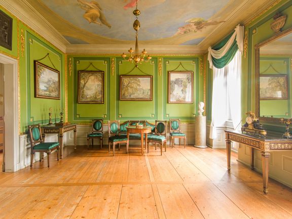 Among the highlights of the exhibition are the furnishings of the Round Table room, the ceiling mural in the dining room, and Anna Amalia’s almost entirely authentic parlour, the Green Salon.