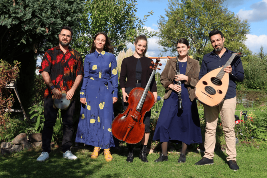 Vocals, clarinet, oud, cello and darbuka blend effortlessly across different genres and musical traditions. The transcultural ensemble Risha (Arabic for “feather” or “plectrum”) oscillates between classical, folk and pop music.