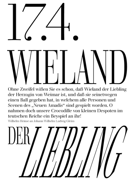 "Without a doubt you already know that Wieland is the darling of the Duchess of Weimar, and that she has given a ball for him at which all the characters and scenes of the ‘New Amadis’ were played. O that our little crocodile despots in the German Empire might follow her example!” Wilhelm Heinse to Johann Wilhelm Ludwig Gleim