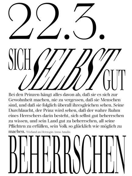 “With the princes, everything depends on this: they must make a habit of never forgetting that they are human, and therefore see their equals wherever they look. His Highness the Prince will see that a ruler’s true glory consists in being able to rule himself well, and ruling his country well, fulfilling all his duties, making his people as happy as possible.” Wieland to Duchess Anna Amalia