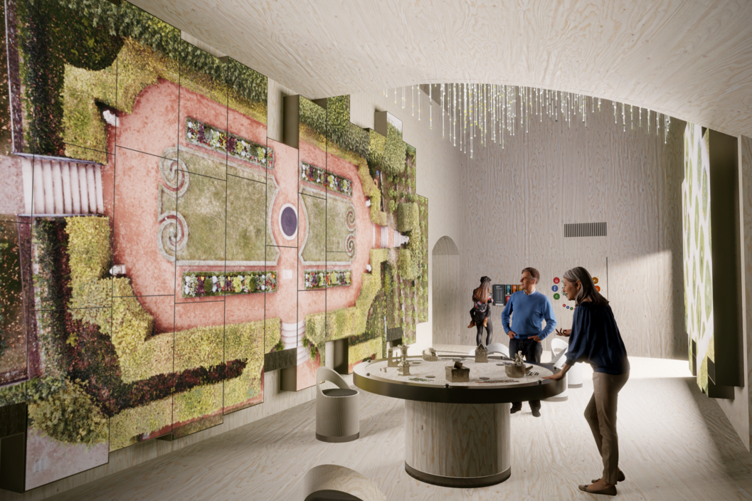 Besucherinnen und Besucher kommen hier rein, treten an den drehbaren Tisch und können dort eine Tour auswählen, indem sie das Symbol auf den Zeiger drehen. Der Film wird ausgelöst.