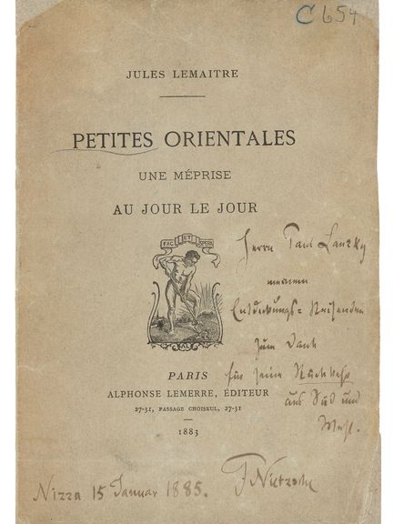 Nach Nietzsches geistigen Zusammenbruch in Turin im Januar 1889 wurde dessen »nachgelassene Bibliothek« durch seine Mutter und seine Schwester zusammengetragen und zuerst in Naumburg, ab 1896 im Weimarer Nietzsche-Archiv verwahrt.