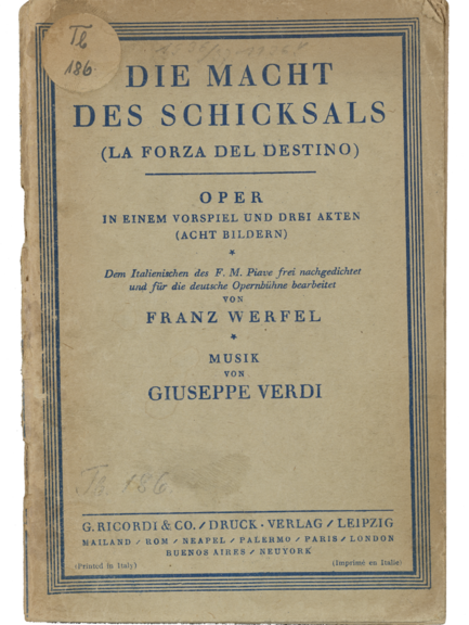 Zudem finden sich im Bestand seltene Libretti aus der Zeit vom 18. bis zum 20. Jahrhundert, die in vielen Fällen nur als Bühnenmanuskript erhalten sind (u.a. Franz Werfels Nachdichtung des Librettos zu Verdis „Die Macht des Schicksals“, 1926).