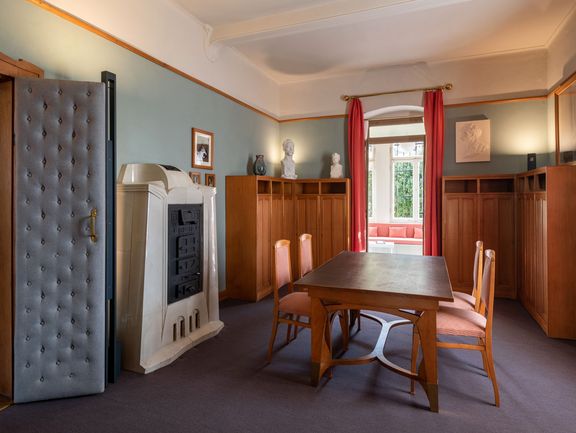 Le revêtement de sol moderne usé du salon et de la salle d'archives a été remplacé. Le type et la pose du nouveau revêtement - tendu à grands frais avec des vis en laiton - se rapprochent autant que possible du modèle historique. Les revêtements muraux des pièces du rez-de-chaussée ont également été revus.