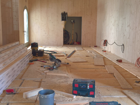 Le bâtiment a été construit en bois massif contreplaqué (et donc à partir de matières premières renouvelables). Les différents modules de murs et de plafonds ont été préfabriqués en usine et assemblés sur le chantier en quelques jours. La façade inhabituelle en panneaux d'écorce de bouleau souligne d'une part le caractère temporaire et peut en même temps être interprétée comme une référence indirecte à une autre architecture prévue à l'origine de manière éphémère : la Borkenhäuschen dans le parc sur l'Ilm.