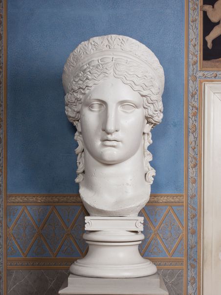 Als seine „erste Liebschafft in Rom“ bezeichnete Johann Wolfgang von Goethe die Kolossalbüste, deren Gipsabguss heute im Dichterwohnhaus zu sehen ist. Das zugehörige Marmororiginal sah er 1787 auf seiner Italienreise in der Villa Ludovisi in Rom. Heute gilt die Büste als das Idealporträt einer römischen Kaiserin. Goethe und seine Zeitgenossen sahen in ihr jedoch das „Symbol griechischer Kunst schlechthin“ und hielten sie für ein Bildnis der Göttin Juno. Und so gab die Büste dem Raum im Wohnhaus – nicht zuletzt aufgrund ihrer dominierenden Größe – den Namen Junozimmer. Der komplette Juno-Kopf ist ein über ein Meter großer Gipsabguss, den Goethe 1823 als Geschenk von Staatsrat Schultz aus Berlin erhielt. Mit Sockel misst die Büste 154,2 cm. In Goethes Sammlungen befinden sich mehrere Zeichnungen von der Plastik, darunter auch eine aus der Feder des Dichters. Mehr Informationen zu der Büste erhalten Sie in den Digitalen Sammlungen der Museen.