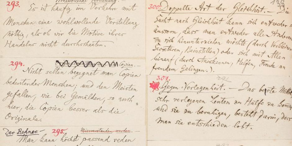 Anlässlich des 170. Geburtstages von Friedrich Nietzsche präsentiert das Gothe- und Schiller-Archiv 2014 eine Kabinettausstellung zum Nachlass des Philosophen. Der in seltener Vollständigkeit überlieferte Bestand geht zurück auf die Sammlungen von Elisabeth Förster-Nietzsche, die seit 1894 den Nachlass ihres Bruders verwaltete und beständig ergänzte. Anhand verschiedener Themenschwerpunkte gibt die Ausstellung Einblicke in Nietzsches Leben, Denken und Arbeiten sowie den Umgang mit seinem Nachlass. So wird die Handschrift des Philosophen zwischen schöpferischen Hochphasen, Augenleiden und Wahnsinn ebenso thematisiert wie seine Arbeitsweise, die anhand eines Aphorismus' aus dem Werk „Menschliches Allzumenschliches” nachvollzogen werden kann. Neben seinem Verhältnis zu Richard Wagner, das Nietzsche bis in seine letzte Schaffensphase reflektiert hat, wird auch zentralen Gedanken seiner Philosophie, wie der „Ewigen Wiederkunft des Gleichen” und der „Umwerthung aller Werthe” nachgespürt. Ein weiterer Komplex zeigt den manipulativen Umgang Elisabeth Förster-Nietzsches mit dem Erbe ihres Bruders. Durch die Reihe gezielter Fälschungen versuchte die Gründerin des Nietzsche-Archivs sich als engste Vertraute des Philosophen zu legitimieren. Ein signifikantes Beispiel ihrer Vorgehensweise, ein von Nietzsche ursprünglich an eine Freundin gerichteter Brief der nachträglich an sie umadressiert ausgegeben wurde, wird ebenso präsentiert wie Dokumente zur Kompilation „Der Wille zur Macht”, Nietzsches vermeintlichem Hauptwerk, dessen Publikationen ebenfalls auf die Initiative seiner Schwerster zurückgeht.
