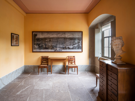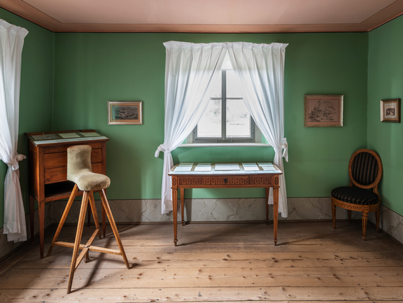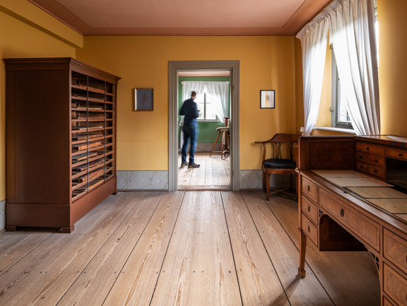 Der Rundgang umfasst das Speisezimmer – das sogenannte „Erdsälchen“ – und die Küche im Erdgeschoss sowie vier Räume in der oberen Etage als Goethes Arbeits-, Wohn- und Schlafbereich.