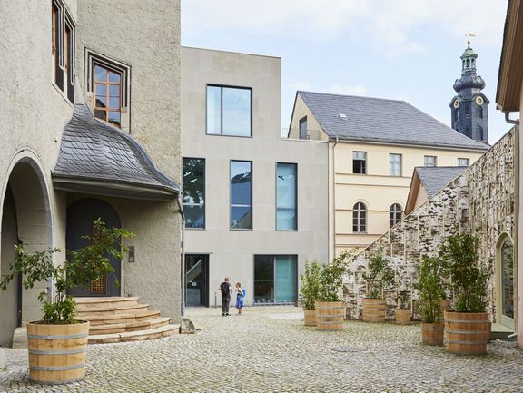 Für das Studienzentrum wurde ein historischer Gebäudekomplex umgestaltet. Das sogenannte Rote Schloss ist das älteste und architektonisch interessanteste Gebäude. Es wurde 1576 als Witwensitz für die Gemahlin des Herzogs Johann Wilhelm, Dorothea Susanna, errichtet. Bereits um 1630 wurde hier schon einmal eine größere Anzahl an Büchern aufbewahrt, die Privatbibliothek von Herzog Wilhelm IV. Ein Teil dieser Bücher ist auch heute noch im Besitz der Herzogin Anna Amalia Bibliothek.