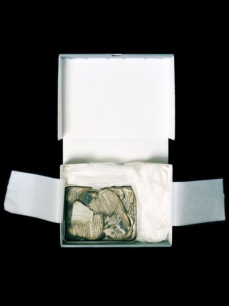 Seine großformatigen Fotografien zeigen palettenweise gestapelte graue Kartonschachteln, in denen die Reste der geretteten, noch nicht restaurierten oder nicht restaurierbaren Aschebücher aufbewahrt werden. Detailaufnahmen offenbaren den Inhalt einzelner Kartonschachteln. Arrangiert werden die unterschiedlichen Bildformate als Diptychen.