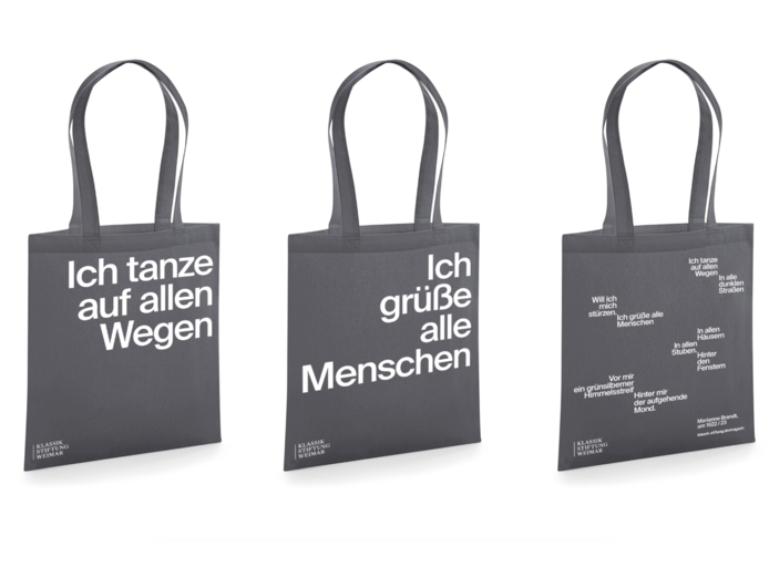 Nachhaltig, modern und ein absoluter Hingucker: der offizielle Stoffbeutel zum Themenjahr "Auf/Bruch" mit dem Gedicht von Marianne Brandt aus unserem Magazin "klassisch modern". Bestellen Sie jetzt für 7 Euro pro Stück Ihre persönliche Tragetasche und schaffen Sie sich Ihr Andenken an den Weimar-Besuch. Die Tasche ist in zwei verschiedenen Vorderseiten erhältlich: "Ich tanze auf allen Wegen" und "Ich grüße alle Menschen". Auf der Rückseite ist bei beiden Taschen das gesamte Gedicht ausgedruckt.
