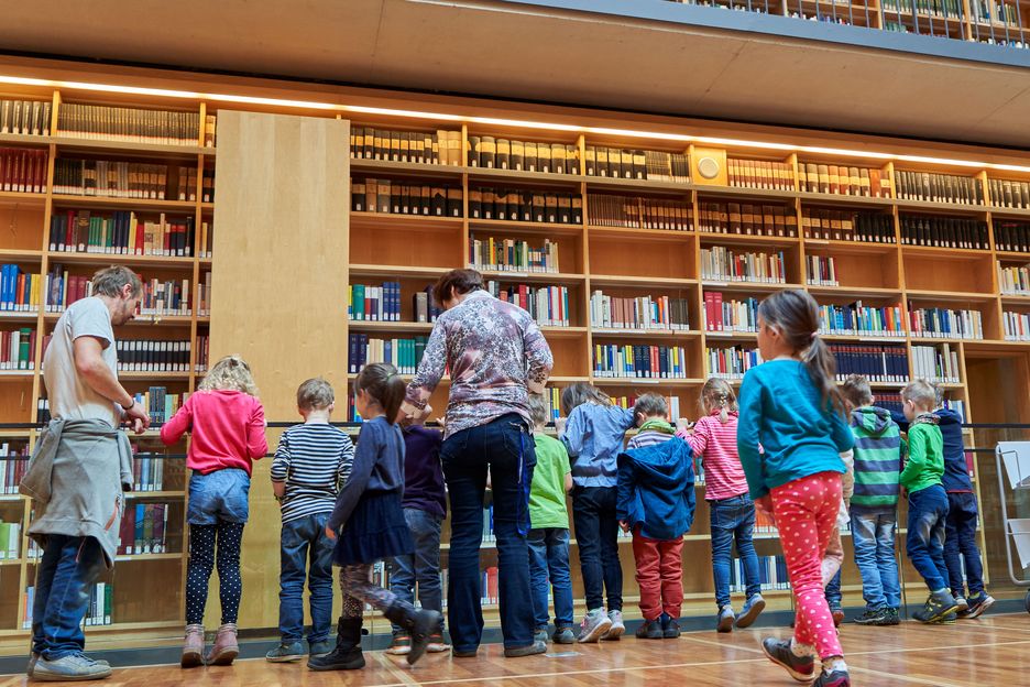 Mit Kindern auf Erkundungstour durch die Bibliothek: Von ganz oben bis nach ganz unten, vorbei an vollen Bücherregalen und immer neuen Ausblicken. Im Büchermagazin, das sich unter dem Platz der Demokratie befindet, sind dann ganz besondere Bücher zu entdecken: Comics, alte Kinderbücher und Walt-Disney-Hefte. Und nicht nur das: Sogar Klopapier und eine Bierflasche gibt es hier!