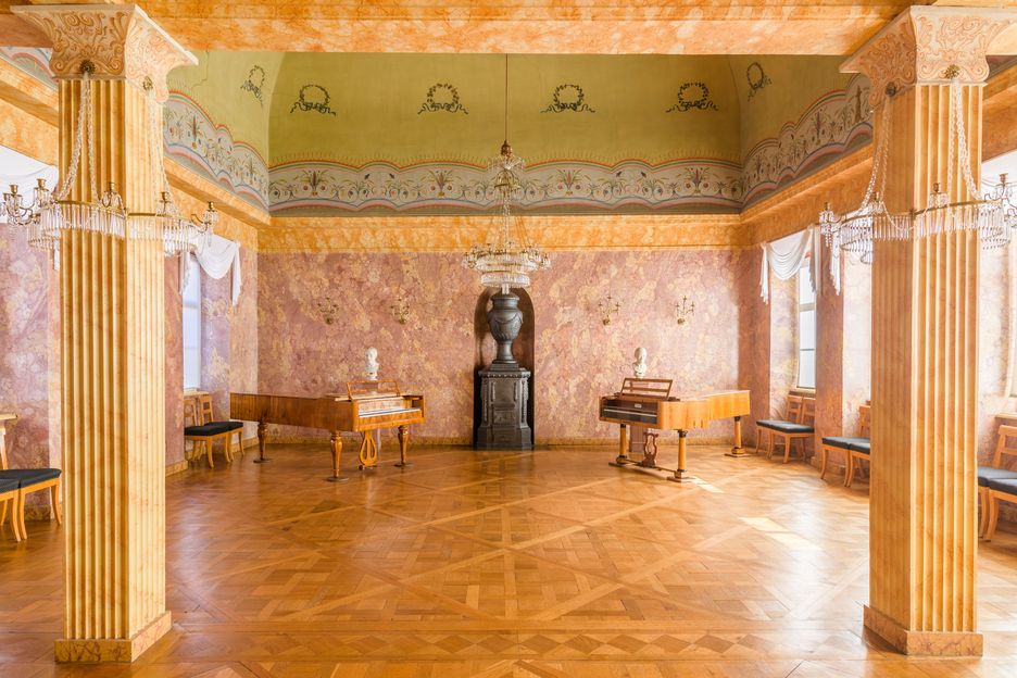 Geführte Tour mit Musik, mit dem Pianisten Bastian Uhlig an den historischen Tasteninstrumenten.