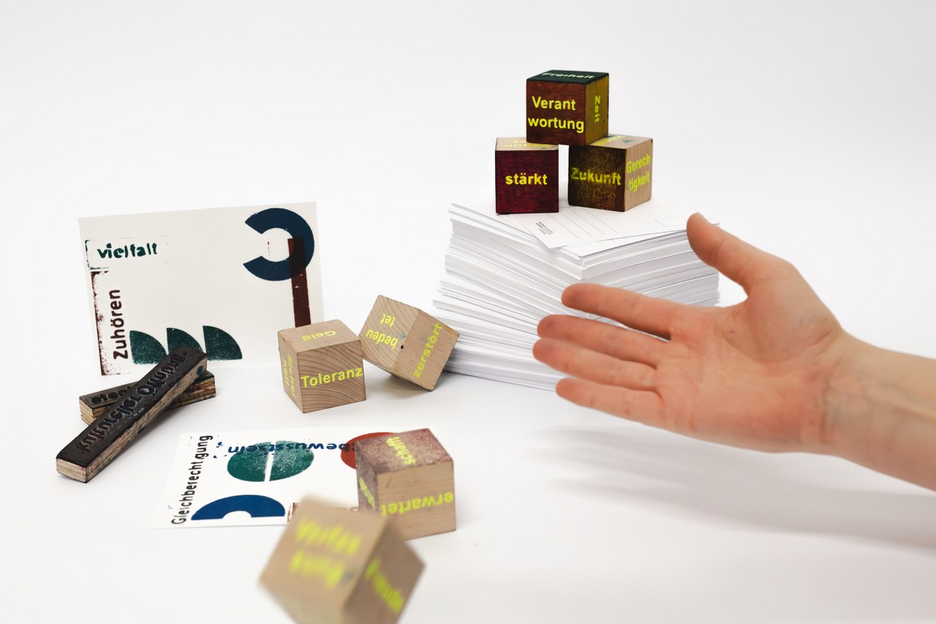 Gestalte eine Postkarte mit einer Botschaft: Lass dich beim Bedrucken von Motiven des Bauhauses und unseren Wortwürfeln inspirieren.