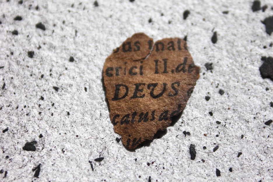 „Ars Ignis“ widmet sich jenen Resten von Büchern, die nicht restauriert werden konnten. Die Künstlerin arbeitet mit Fragmenten loser Buchseiten und groben Aschepartikeln.