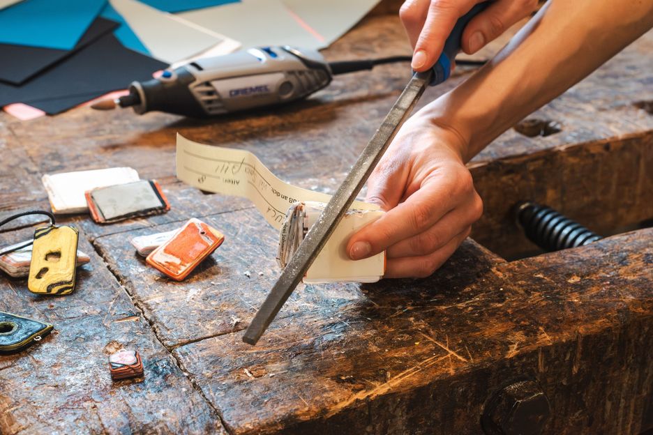 In unserer Upcyclingwerkstatt nutzen wir Papierreste aus dem Museumsalltag und entwickeln aus ihnen ein ganz neues Material. Denn zu einem Stapel verklebt und fest gepresst, wird aus Altpapier ein Werkstoff, der sich mit Schleifmaschine, Dremel und Feile verarbeiten lässt.