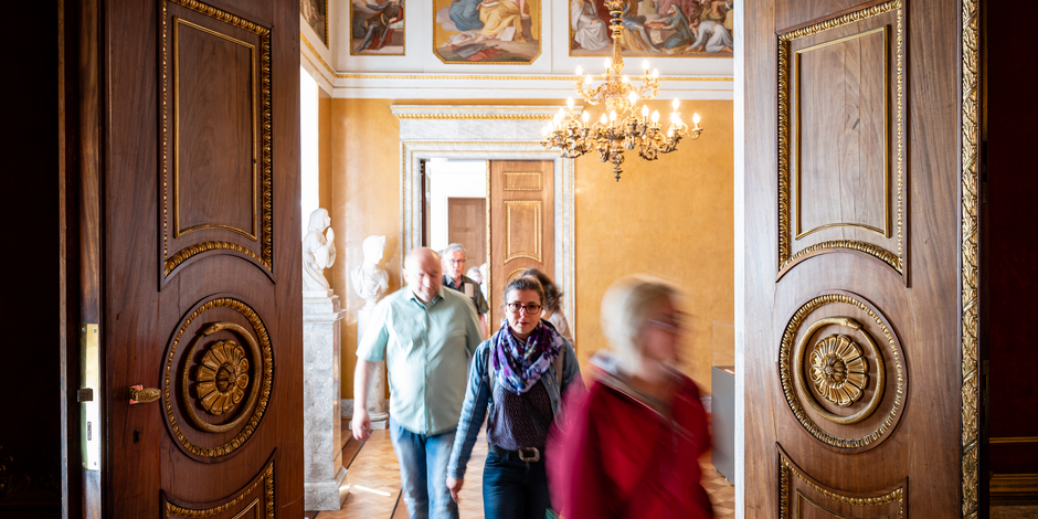 Von Rosenberg: Ja, im Grundriss sieht es ein bisschen aus wie eine kleine Rennbahn, weil das ein langgestrecktes Oval ist und wir haben diese markanten Leuchter, wo man sich ein bisschen streitet, ob es nun Adler oder Falken sind. Auch in dieser klassizistischen Raumfassung, wurde auch als Galerie genutzt und wohl auch für den Orden des "Weißen Falken". Es ist eins der tollen Raumkunstwerke, die wir hier im Schloss haben.